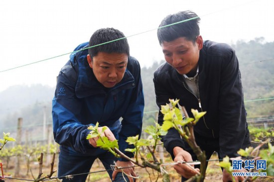3月30日,王涛(左)与村民交流葡萄种植技术。