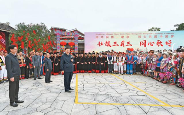 广西是我国少数民族人口最多的自治区。27日上午,习近平来到位于南宁市邕江之畔的广西民族博物馆,参观壮族文化展。博物馆外,三月三“歌圩节”壮族对歌等民族文化活动正在这里集中展示。习近平强调,广西是全国民族团结进步示范区,要继续发挥好示范带动作用。各民族共同团结进步、共同繁荣发展是中华民族的生命所在、力量所在、希望所在,在全面建设社会主义现代化国家的新征程上,一个民族都不能少,各族人民要心手相牵、团结奋进,共创中华民族的美好未来,共享民族复兴的伟大荣光。